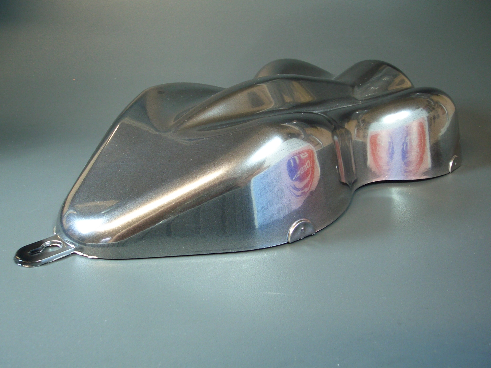 2: Den Chromlack mit einer Spritzpistole 0,8 mm Düse ( Druck 1 Bar ) lackieren ( für kleine Teile ) , bzw. mit einer Spritzpistole mit 1,0 - 1,2 mm Düse für große Flächen in 2-3 Spritzgängen sehr dünn lackieren. ( eher nebeln ) Zwischenablüftzeit 10 Minuten.