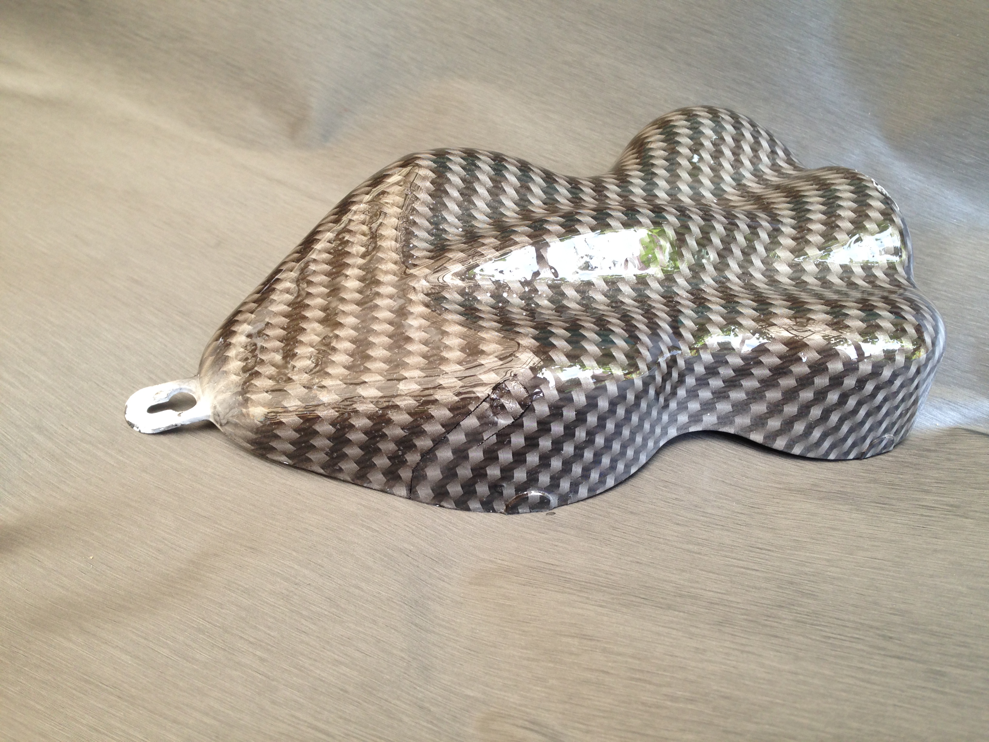 Der Wassertfransferdruck ist ein Tauchbadverfahren, mit dem aus langweiligen Oberflächen optisch edle Designs werden. Dabei wird ein beliebiges Teil in einem Tauchbad durch eine hauchdünne Folie getaucht und anschließend mit Klarlack überzogen .