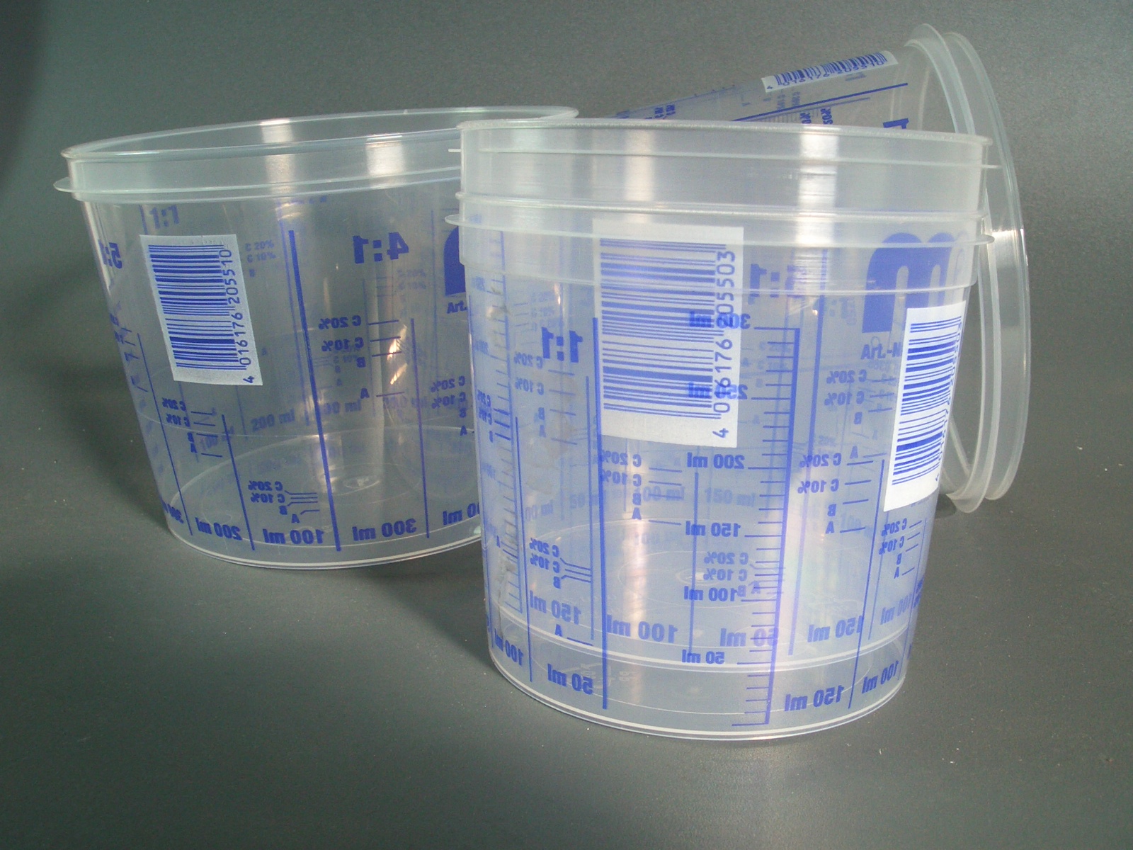 Mischbecher :  375 , 750, 1400  ml transparenter Kunststoff mit exakter und optimal lesbarer Skalierung  Mischskala 1:1, 2:1, 3:1, 4:1, 5:1, 10:1 und Milliliter